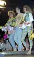 Modeshow Bluetiek-in. Model met op de achtergrond twee beeldmerken van Joey Fresco en het Italiaanse Fiorucci, destijds populair.
