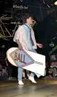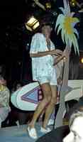 Modeshow Bluetiek-in. Denim kleding laag over laag en strandsurfboard met het destijds populaire logo van Ball kleding.
