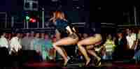 Zangeressen Cecilia de la Rie (links) en Rowan Moore. Op hoge hakken en in een lingerieachtige outfit verzorgt de Nederlandse meidengroep Centerfold een optreden in discotheek BlueTiek-in, 7 juni 1984.