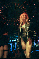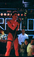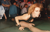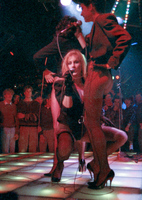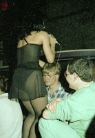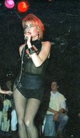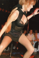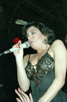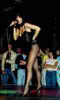 Zangeres Laura Fygi in een zwarte body, met netkousen en zwarte kanten handschoentjes. Op hoge hakken en in een lingerie-achtige outfit verzorgt de Nederlandse meidengroep Centerfold een optreden in discotheek BlueTiek-in, 7 juni 1984.