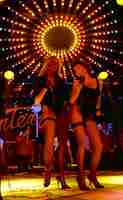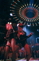 Zangeressen Cecilia de la Rie (links) en Rowan Moore op het podium. Op hoge hakken en in een lingerieachtige outfit verzorgt de Nederlandse meidengroep Centerfold een optreden in discotheek BlueTiek-in, 7 juni 1984.