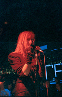Zangeres Rowan Moore op het podium in zwarte netkousen en een kousenband. Op hoge hakken en in een lingerieachtige outfit verzorgt de Nederlandse meidengroep Centerfold een optreden in discotheek BlueTiek-in, 7 juni 1984.
