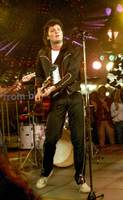 Een optreden van de Haagse band Golden Earring in het programma Sky-Fi music, opgenomen in de Rotterdamse discotheek BlueTiek-in. Links bassist Rinus Gerritsen, midden zanger en gitarist Barry Hay en rechts gitarist George Kooymans, 23 november 1984.