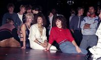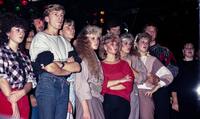 Publiek kijkt naar de Nederlandse discogroep Mai Tai die optreedt in de Rotterdamse discotheek BlueTiek-in. De jonge vrouwen hebben gepermanent haar en dragen haarbanden [sjaals] om hun voorhoofd. Een jongen draagt zijn trui in zijn broek.