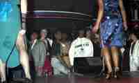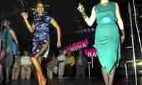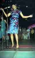 Het publiek kijkt naar het optreden van Marsha Raven en haar achtergrondzangeres. Marsha draagt een jurk met hoge splitten naar Chinees model in een Chinese stof.