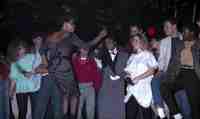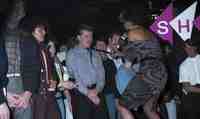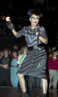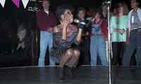 De Amerikaanse zangeres Sharon Redd trekt plagend aan de stropdas van een jonge man in het publiek tijdens haar optreden in de Rotterdamse discotheek BlueTiek-in, 19 januari 1984.