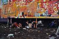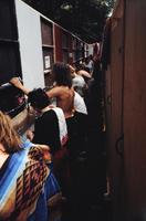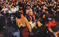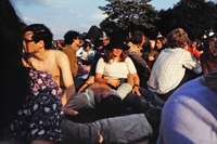 Kleurenfoto van bezoekers, zittend onder een omheining