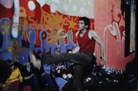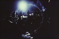 Kleurenfoto van bezoekers in de avond, met tegenlicht van een schijnwerper