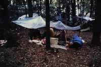 Kleurenfoto van bezoekers onder een regenzeil in het bos
