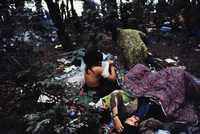 Kleurenfoto van meerdere bezoekers op de grond in het bos