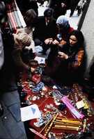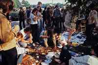 Kleurenfoto van bezoekers met een kleedje op de grond