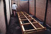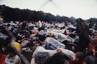 Kleurenfoto van publiek, schuilend onder regenzeiltjes