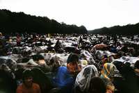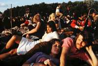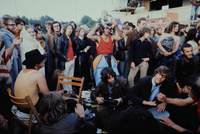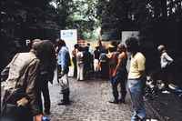 Kleurenfoto van groepje bezoekers op de grond van het festivalterrein