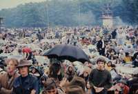 Kleurenfoto van publiek met een paraplu op de voorgrond