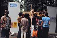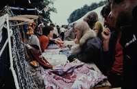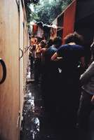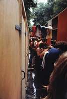 Kleurenfoto van publiek bij de sanitaire voorzieningen