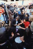 Kleurenfoto met close-up van drie bezoekers in de menigte