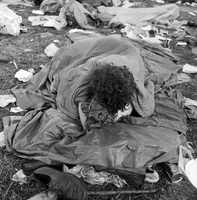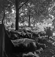 Bezoekers liggen onder een zeiltje tijdens een regenachtige dag bij het Holland Pop Festival