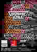 Blauw zwarte afbeelding van een persoon met een capuchon op en van achter afgebeeld. Naam van het event in geel/oker kleur in graffiti stijl. De namen van de bands en de onderkant van de flyer in drie pastel tinten oker. Namen van de bands in fantasieletters.