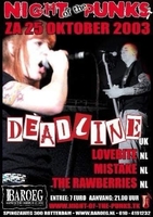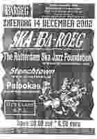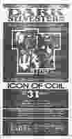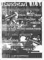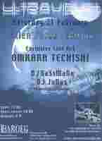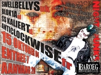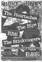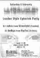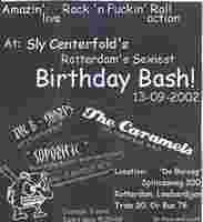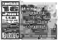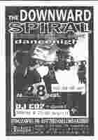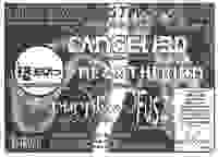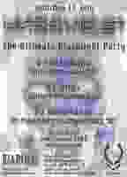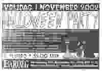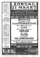 Zwart wit flyer. Witte letters op zwart. Aleen tekst. Naam event, namen bands en onderop details over locatie, datum, tijd en toegangsprijs van het event.